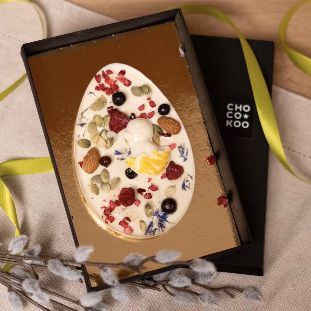 White chocolate (sugar, cocoa butter, whole milk powder, sunflower lecithin, natural vanilla extract), berry and nut mix (dried cranberries (cranberries, sugar, sunflower oil), raisins (raisins, sunflower oil, preservative: sulphur dioxide), roasted almonds, pumpkin seeds, blanched almonds, goji berries (goji berries, preservative: sulphur dioxide), Brazil nut).