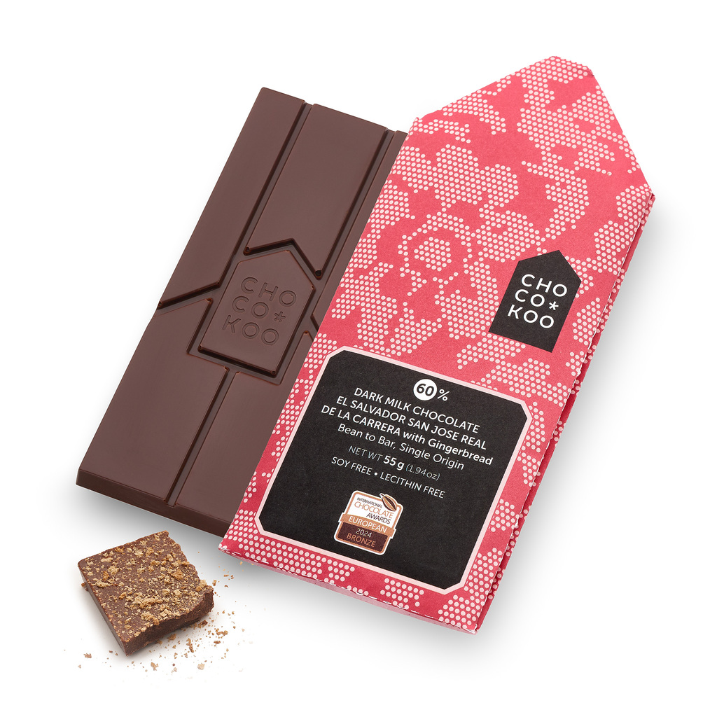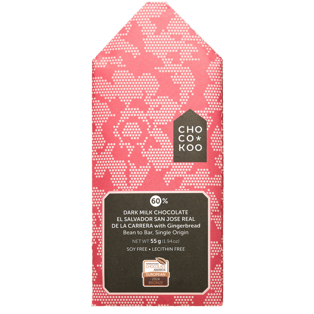 Product of Estonia. This chocolate bar is made with cacao beans from La Carrera farm in El Salvador. Gingerbread crumbs garnish the chocolate bar’s back.