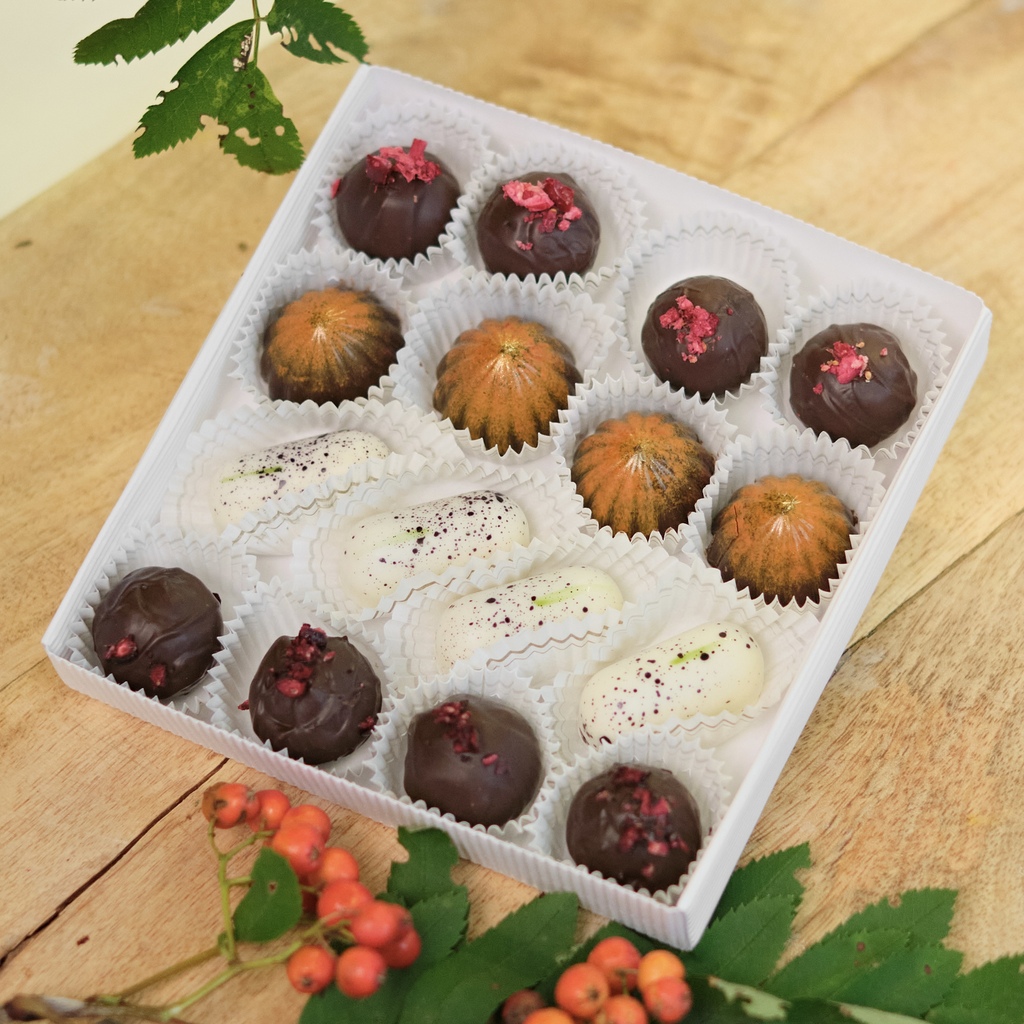 Valrhona couverture chocolate and fruit purees are used to make these bonbons and truffles.