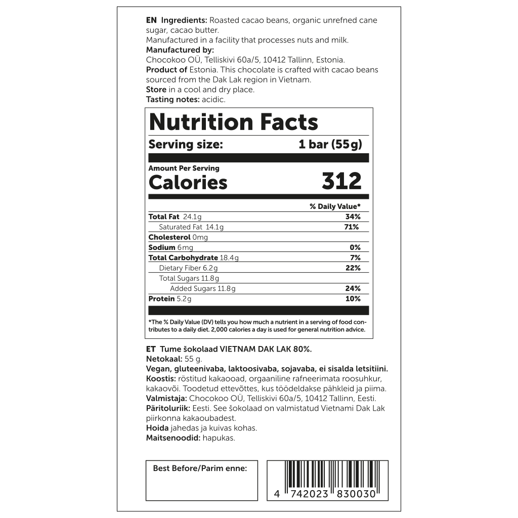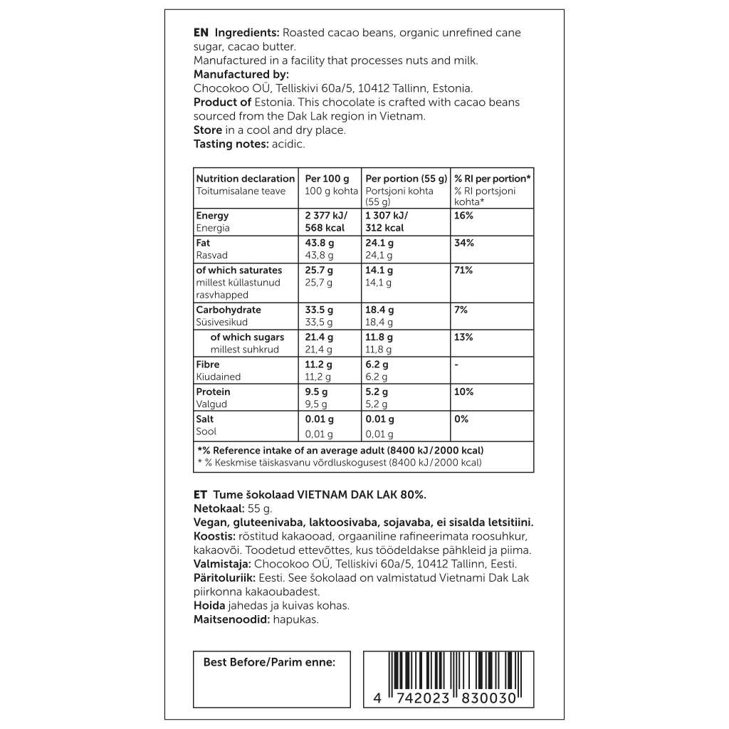 Alkuperämaa: Viro. Vietnam 80% tumma suklaa on valmistettu Vietnamin Mekong Deltan alueen kaakaopavuista. Suklaa on miellyttävän hapokasta ja siinä on voimakas jälkimaku.