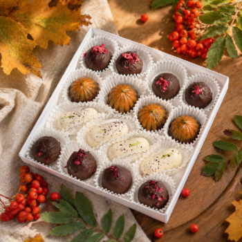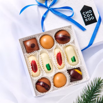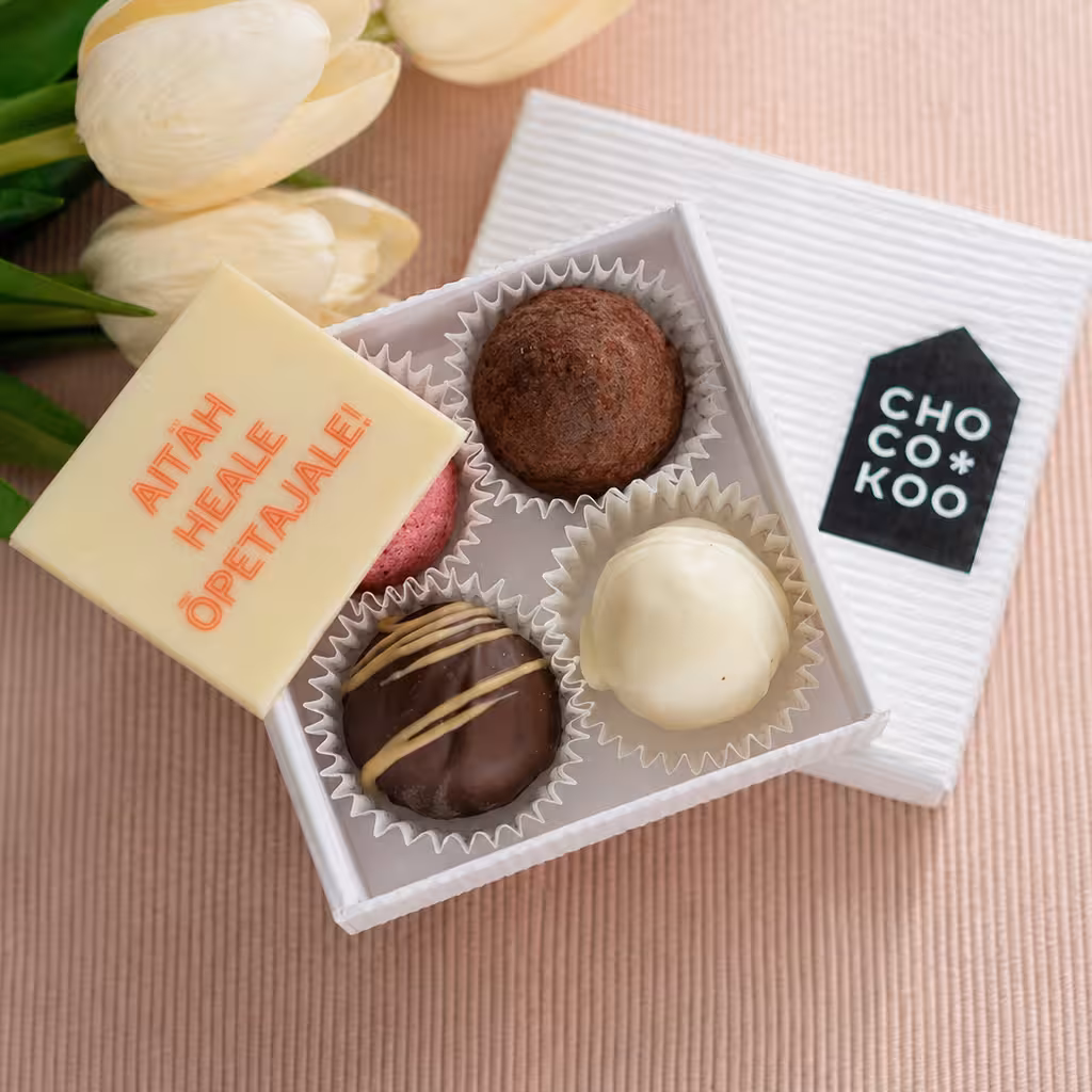 Valge šokolaad (suhkur, kakaovõi, täispiimapulber, päevalille letsitiin, naturaalne vanilliekstrakt), suhkur, vahukoor (piim), tume šokolaad (suhkur, kakaooad, kakaovõi, emulgaator: päevalille letsitiin, naturaalne vanilliekstrakt), litši-vaarikapüree, glükoos, või (piim), pirnipüree, vesi, piimašokolaad (kakaovõi, täispiimapulber, suhkur, kakaouba, pruunsuhkur, naturaalne vanilliekstrakt, päevalille letsitiin, odralinnaseekstrakt), külmkuivatatud jõhvikapulber, kakaopulber, ingverimahl, dulcey šokolaad (kakaovõi, suhkur, täispiimapulber, lõssipulber (piim), vadak (piim), või (piim), päevalille letsitiin, naturaalne vanilliekstrakt), apelsinikoor, muskaatpähkel, vanill.