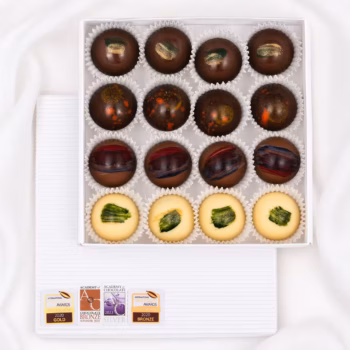 Valge šokolaad (suhkur, kakaovõi, täispiimapulber, päevalille letsitiin, naturaalne vanilliekstrakt), piimašokolaad (kakaovõi, täispiimapulber, suhkur, kakaouba, pruunsuhkur, naturaalne vanilliekstrakt, päevalille letsitiin, odralinnaseekstrakt), tume šokolaad (suhkur, kakaooad, kakaovõi, emulgaator: päevalille letsitiin, naturaalne vanilliekstrakt), vahukoor (piim), suhkur, litši-vaarikapüree, või (piim), glükoos, pirnipüree, invertsuhkur, pistaatsiapasta (suhkur, pistaatsiapähkel, soja, vadak (piim), sojaletsitiin, invertsuhkur, E141), granadillipüree, bergamoti püree, vesi, külmkuivatatud jõhvikapulber, sidrunipüree, kakaovõi, ingverimahl, sidrunikoor, dulcey šokolaad (kakaovõi, suhkur, täispiimapulber, lõssipulber (piim), vadak (piim), või (piim), päevalille letsitiin, naturaalne vanilliekstrakt), basiilik, kollane toiduvärv asovaba (kakaovõi, värvaine: kurkumiin (E100)), sinine toiduvärv asovaba (kakaovõi, värvaine: E133).