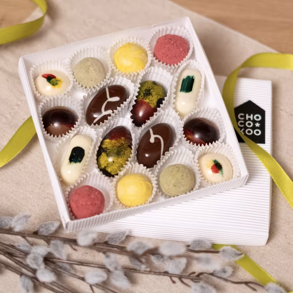 Valge šokolaad (suhkur, kakaovõi, täispiimapulber, päevalille letsitiin, naturaalne vanilliekstrakt), tume šokolaad (suhkur, kakaooad, kakaovõi, emulgaator: päevalille letsitiin, naturaalne vanilliekstrakt), suhkur, piimašokolaad (kakaovõi, täispiimapulber, suhkur, kakaouba, pruunsuhkur, naturaalne vanilliekstrakt, päevalille letsitiin, odralinnaseekstrakt), vahukoor (piim), vesi, või (piim), viigimarjapüree, litši-vaarikapüree, aprikoosipüree, banaanipüree, granadillipüree, glükoos, mandlid, pistaatsiapasta (suhkur, pistaatsiapähkel, soja, vadak (piim), sojaletsitiin, invertsuhkur, E141), külmkuivatatud jõhvikapulber, matcha pulber, kakaovõi, mesi, apelsinikoor, negroni, piparmündilehed, koriandriseemned, kollane toiduvärv asovaba (kakaovõi, värvaine: kurkumiin (E100)), punane toiduvärv asovaba (kakaovõi, värvaine: E120), sinine toiduvärv asovaba (kakaovõi, värvaine: E133).