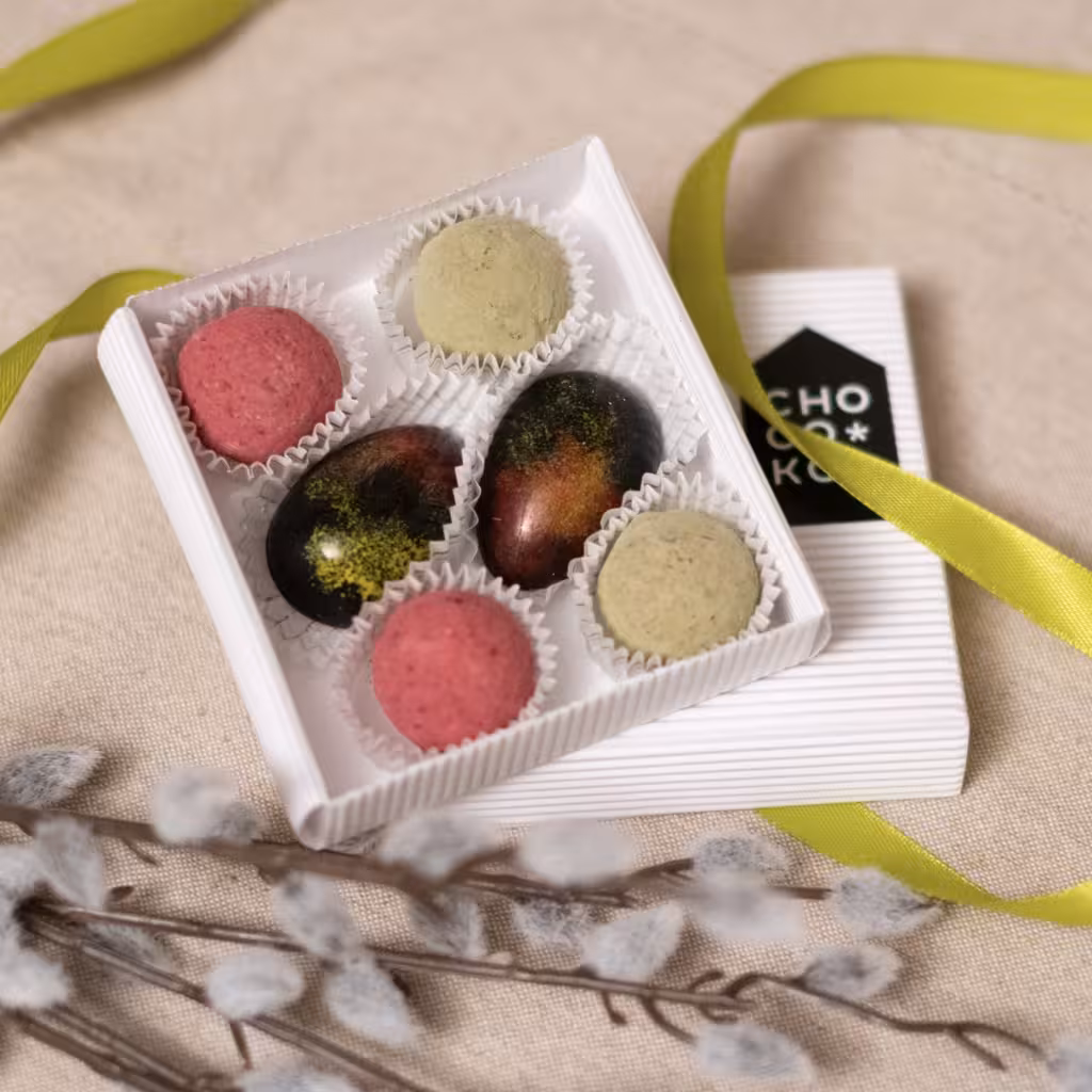 Tume šokolaad (suhkur, kakaooad, kakaovõi, emulgaator: päevalille letsitiin, naturaalne vanilliekstrakt), valge šokolaad (suhkur, kakaovõi, täispiimapulber, päevalille letsitiin, naturaalne vanilliekstrakt), suhkur, litši-vaarikapüree, piimašokolaad (kakaovõi, täispiimapulber, suhkur, kakaouba, pruunsuhkur, naturaalne vanilliekstrakt, päevalille letsitiin, odralinnaseekstrakt), banaanipüree, vesi, vahukoor (piim), või (piim), glükoos, külmkuivatatud jõhvikapulber, matcha pulber, mesi, piparmündilehed, kollane toiduvärv asovaba (kakaovõi, värvaine: kurkumiin (E100)).