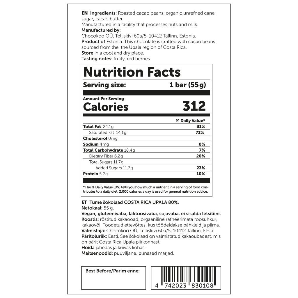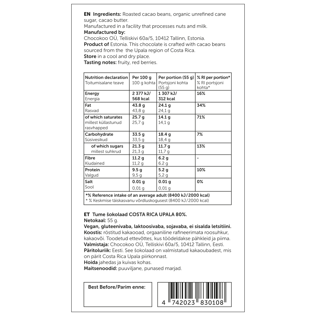Päritoluriik: Eesti. Costa Rica 80% šokolaad on valmistatud Costa Rica Upala piirkonna kakaoubadest. Šokolaad on marjase maitsega ja mõnusalt mõrudam kui Costa Rica 70%.