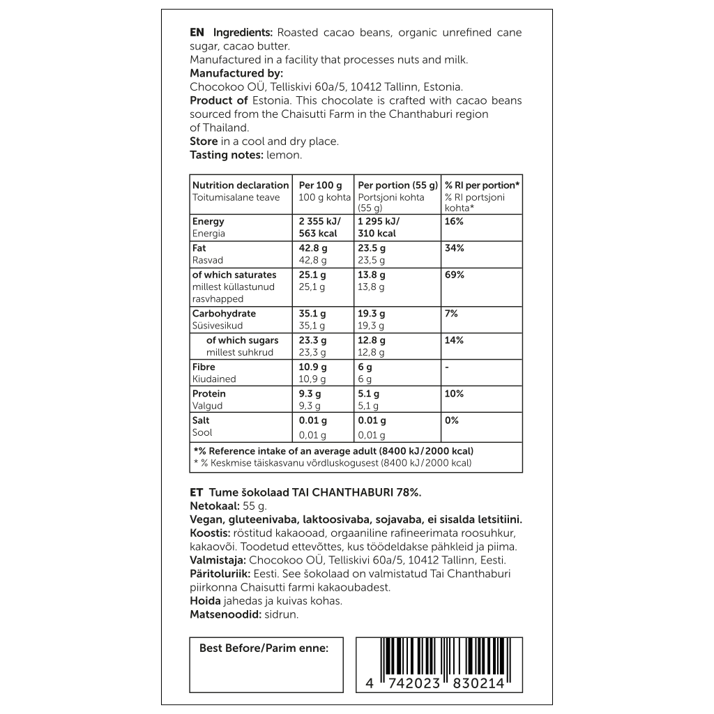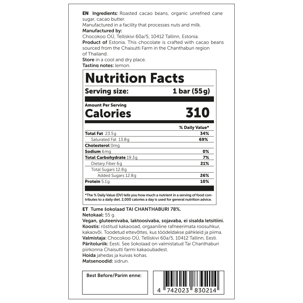 Päritoluriik: Eesti. Tai 78% tume šokolaad on valmistatud Tai Chanthaburi Chaisutti farmi kakaoubadest. Šokolaad on mõnusa puuviljaselt hapuka maitsega.